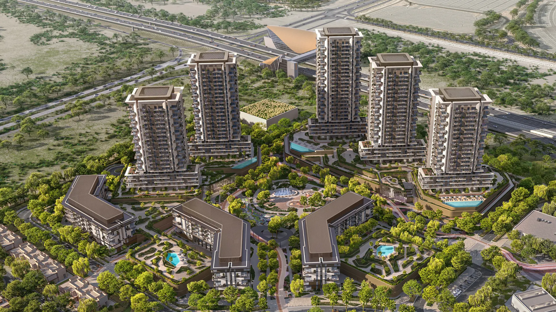 • 1–3BR contemporary apartments • Eight uniquely themed residential towers • Central park-facing community design • Developed by Aldar Properties • Part of Dubai’s first LEED Platinum masterplan • Wellness-focused amenities and green spaces • Modern architecture with sustainable features • Prime location within Dubailand
